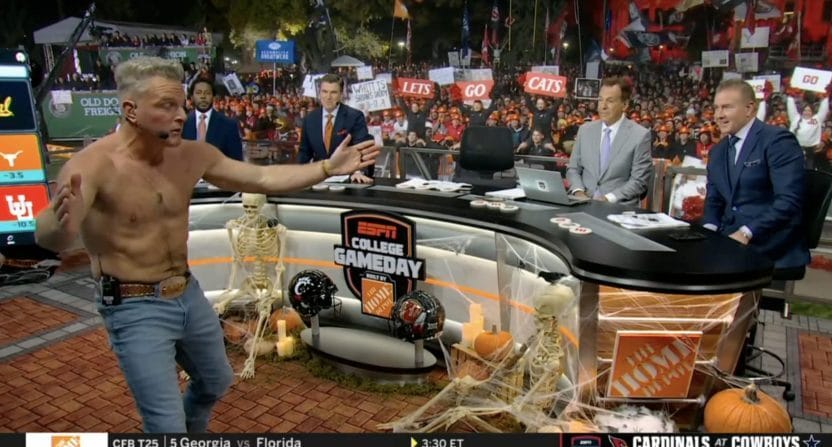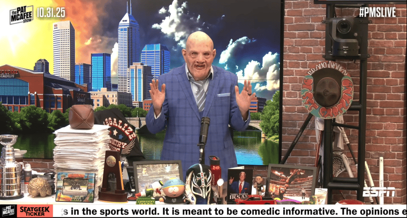 For a Halloween edition of his ESPN show, Pat McAfee dressed up as Peter Neverville, an “old sports media man.” Performing a fake conversation in character on-air, McAfee told a hypothetical version of himself on the other end of the conversation to “shut the f*ck up.”