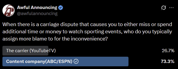 But there is an interesting dynamic going on regarding how blame is being assigned in this dispute. In our very unscientific social media poll last week, 74% of respondents placed the blame on Disney rather than YouTube TV.