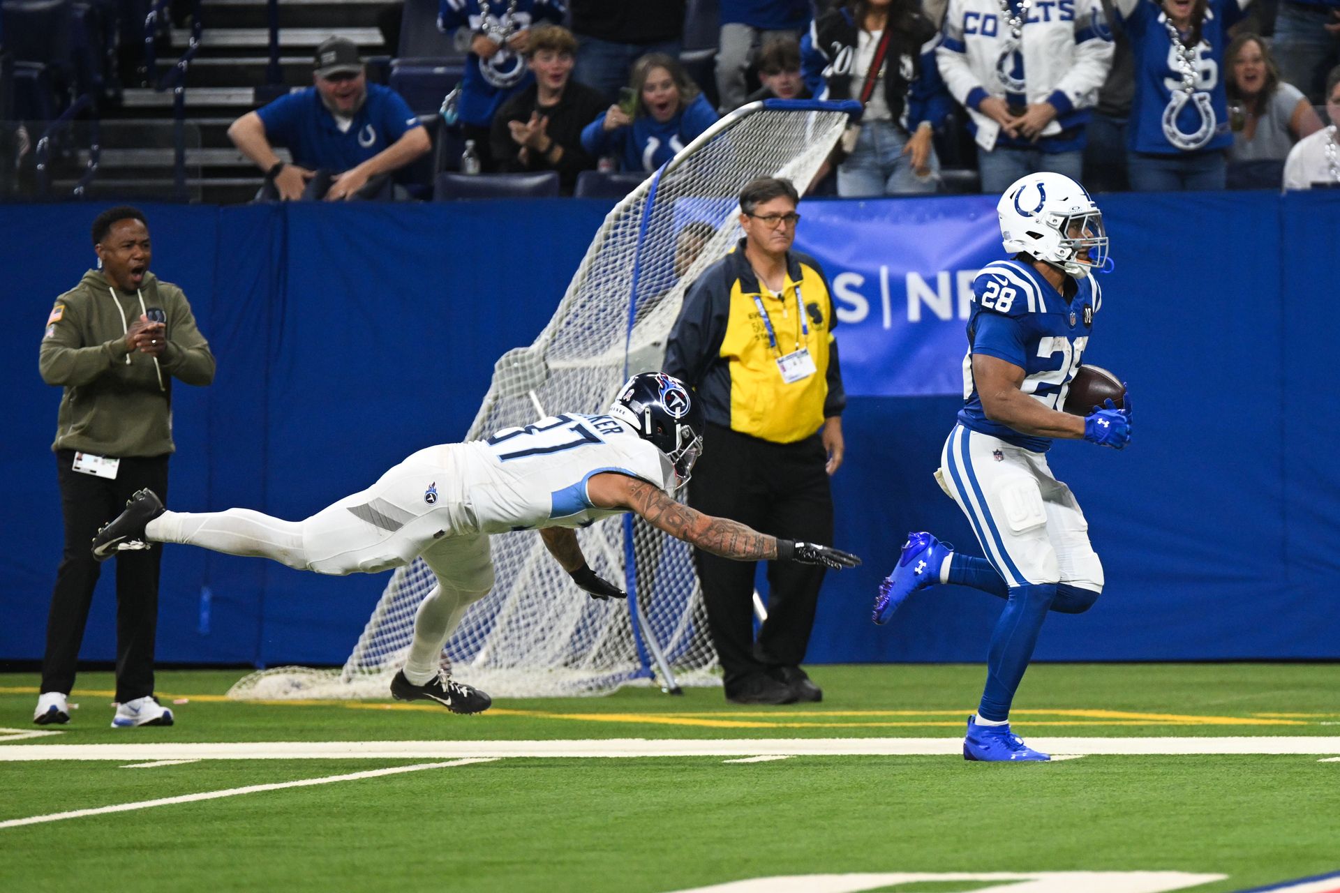 "Pretty pathetic effort in that secondary, trying to bring down Taylor. He is great, but, man, that looked like it lacked a lot of effort, to me." - CBS's Jim Nantz torching the Titans' defense during a game break after Jonathan Taylor jogged untouched for an 80-yard touchdown where neither safety made a serious tackle attempt. Taylor finished with 153 yards and three touchdowns in the Colts' 38-14 win.