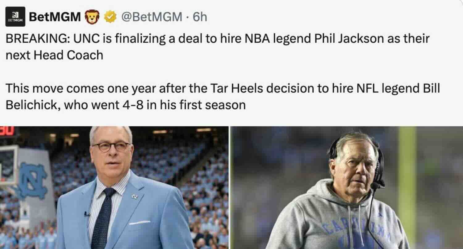 🎰 Don’t bet on it. We’ve seen plenty of fake insiders and parody accounts post fake news for engagement, but we never figured we’d see a “legitimate” account try it. All bets are off now that BetMGM posted a fake report that UNC had hired Phil Jackson as its new men’s basketball head coach. The post went viral, as expected, but got absolutely trashed, which was perhaps not. They ended up deleting the fakery soon after, but not before torching their reputation.