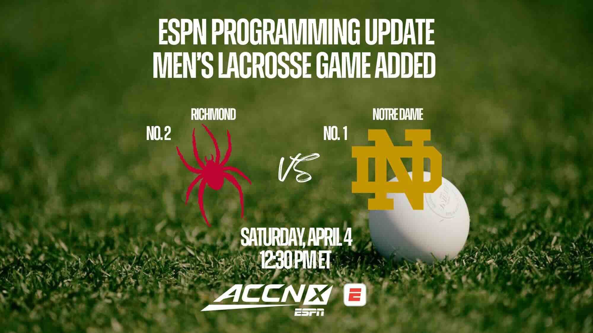 Crisis averted! We almost had a situation where the men’s college lacrosse game of the season wasn’t televised. On Wednesday, ESPN came to the rescue, announcing that the game between No. 1 Notre Dame and No. 2 Richmond would be broadcast on ACCNX and the ESPN App. You could still argue the game deserves to be on linear television, but hey, at this point, beggars can’t be choosers.